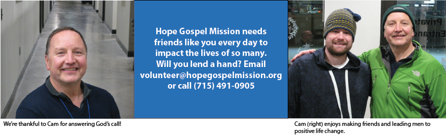 “I was reading through the Old Testament - one chapter per day. After I read the chapter in Job where he had lost everything and his friends first came and comforted him, I reflected and offered a prayer of gratitude that God had placed friends in Job’s life when he needed them. That’s when I felt a prod telling me that there are people in Eau Claire who have lost everything too and need someone to comfort and encourage them. As I prayed further on this, it became clear that God was calling me to minister to the homeless in Eau Claire which ultimately led me to Hope Gospel Mission,” Cam shared.