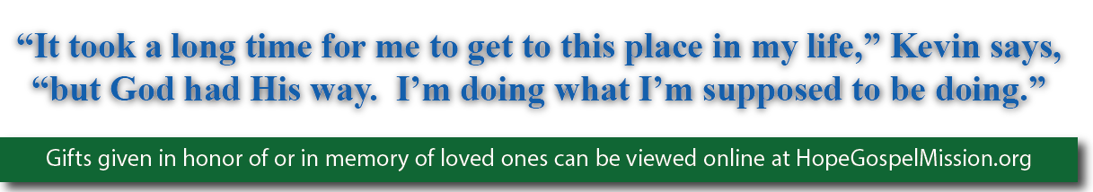 When he arrived at Hope Gospel, Kevin’s grandmother had just died. Only a month into the program, he suffered another devastating loss when his mother passed away. “I was numb, in a deep depression,” he recalls. “Trying to deal with my addiction after losing the two most important people in my life was very difficult.”