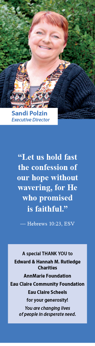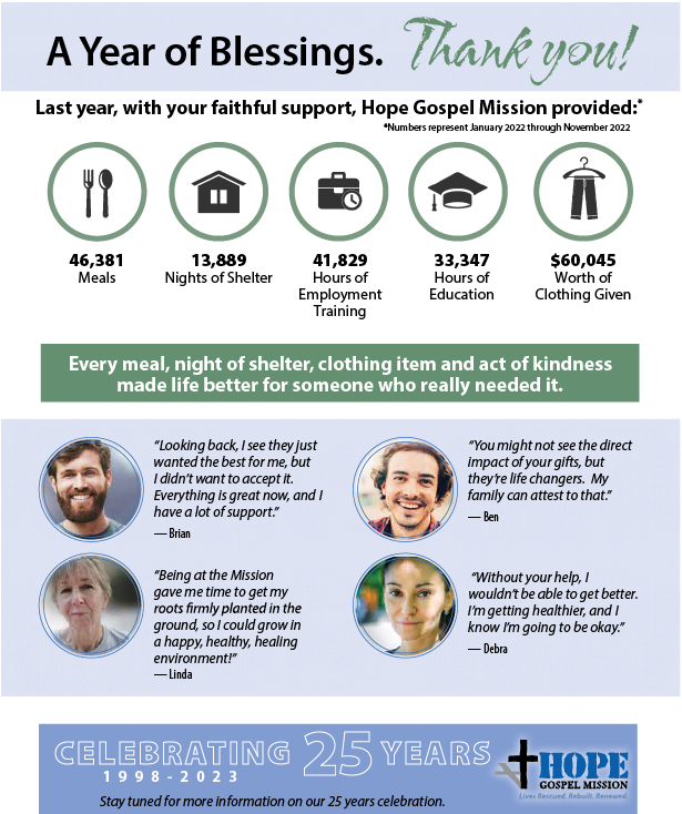 Dear Friend, I have a confession: I did not make a New Year's resolution for 2023. Over the years, I learned resolutions rarely last more than a month or two before we forget them. That’s why I advise the men and women at Hope Gospel Mission to forget about New Year’s resolutions altogether and set goals instead — not just on the first of the year, but for every day, week, month and year and all the way home to heaven. I like to see each day as a gift from God to enjoy as I focus on the work He gives me to do. I expect our residents will achieve what they set out to do. They already accomplish so much during their time here with us. Many wise and caring people want to help them move forward, including you. I’m sure we’ll see much fruit coming from these Godly people. You are part of their success. And not just for them, but for their future generations to come. You also gave our residents the resources they needed to look ahead and visualize a brighter future for themselves and their families. These are wonderful gifts. Thank you! So, if you didn’t make a New Year’s resolution — or have already abandoned it — don’t feel bad. My best thought is to enjoy the day God has given us and look forward to our bright and beautiful future. Thank you, and may God bless you. Sincerely,![]() Sandi Polzin |